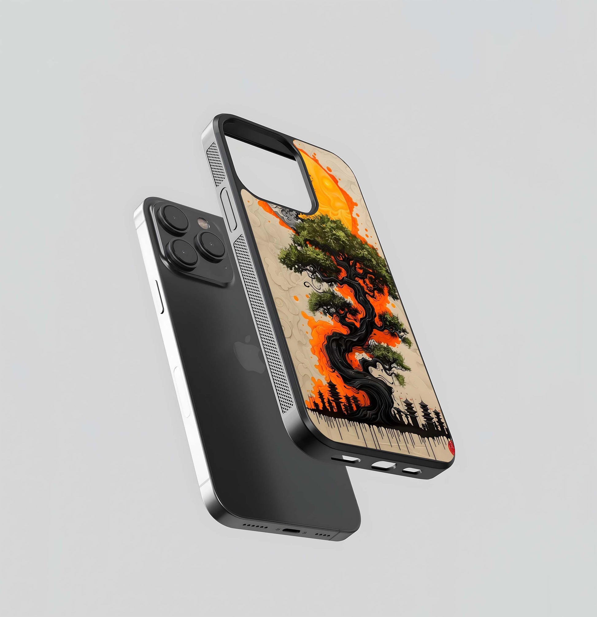 Bonsai with Orange Sun and Waves Glass Case
